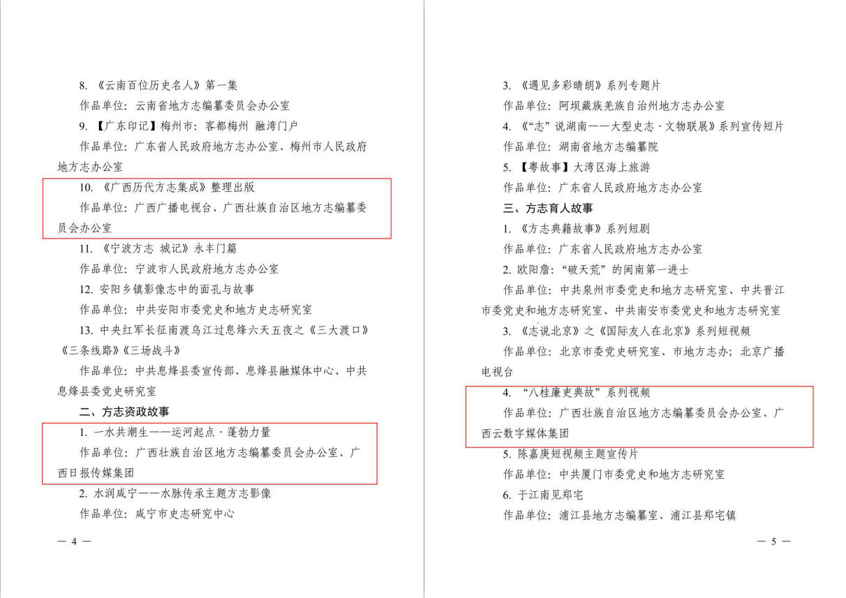 2026年1月9日,中国地方志工作办公室印发《关于公布2025年地方志网络视频征集展播活动入选名单的通知》,自治区地方志办报送的3部原创作品全部入选,其中:《〈广西历代方志集成〉整理出版》入选方志存史故事单元;《一水共潮生——运河起点·蓬勃力量》入选方志资政单元且位居首位,全国仅5部;“八桂廉吏典故”系列视频入选方志育人故事单元。