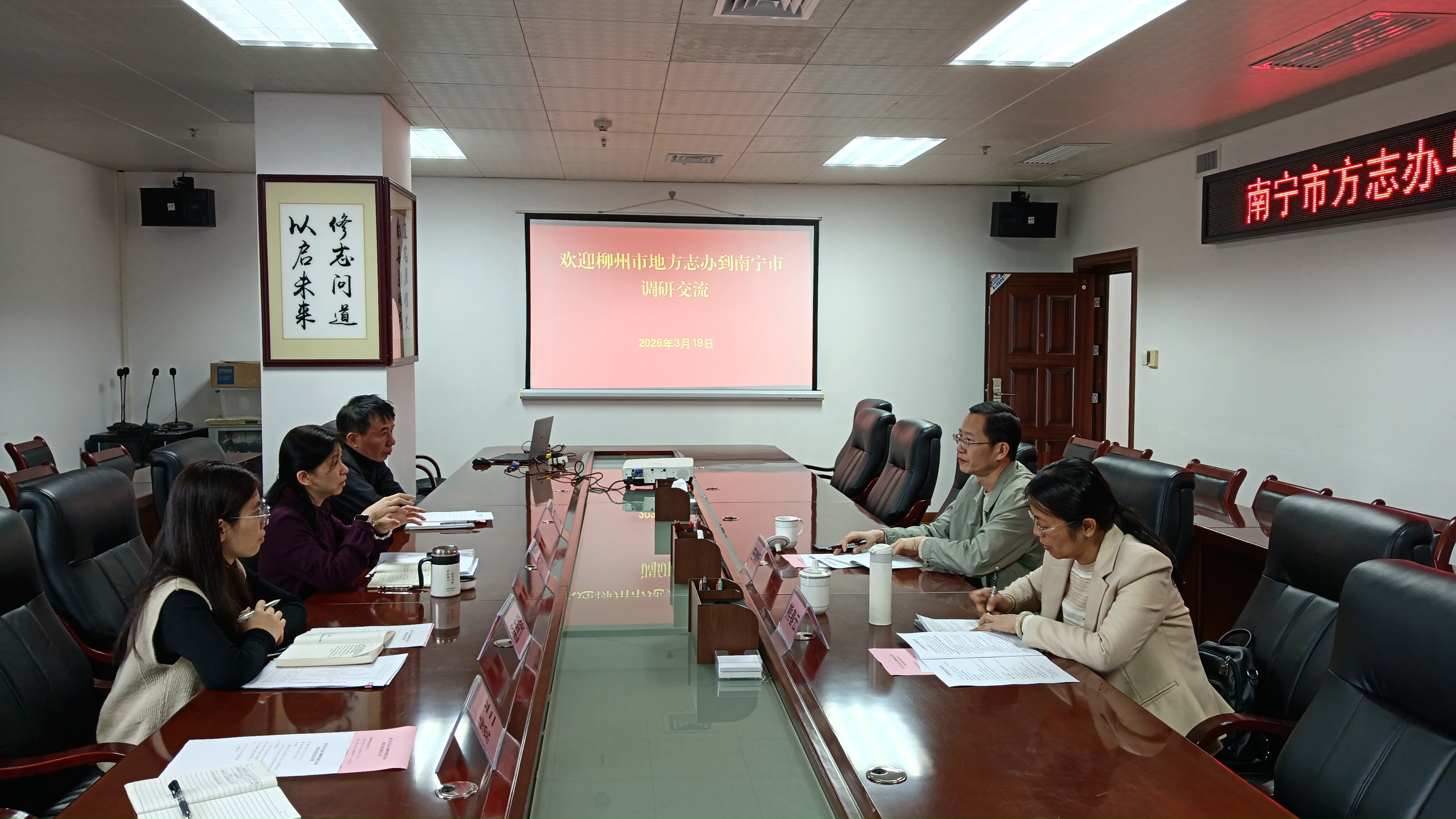 3月18日下午,柳州市地方志办副主任王骕颉(左)与来宾市地方志办主任赖旭辉(右二)及相关科室同志座谈交流。(熊春云摄)