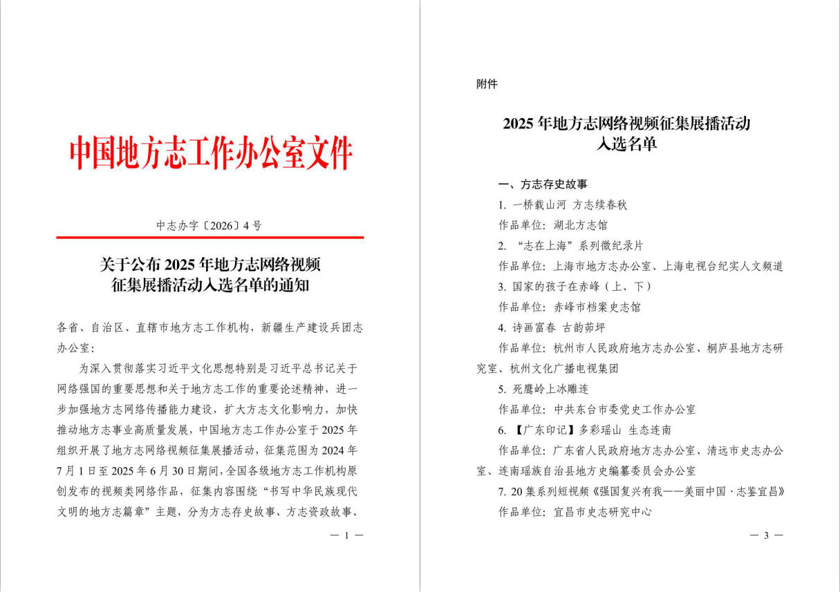 2026年1月9日,中国地方志工作办公室印发《关于公布2025年地方志网络视频征集展播活动入选名单的通知》,自治区地方志办报送的3部原创作品全部入选,其中:《〈广西历代方志集成〉整理出版》入选方志存史故事单元;《一水共潮生——运河起点·蓬勃力量》入选方志资政单元且位居首位,全国仅5部;“八桂廉吏典故”系列视频入选方志育人故事单元。