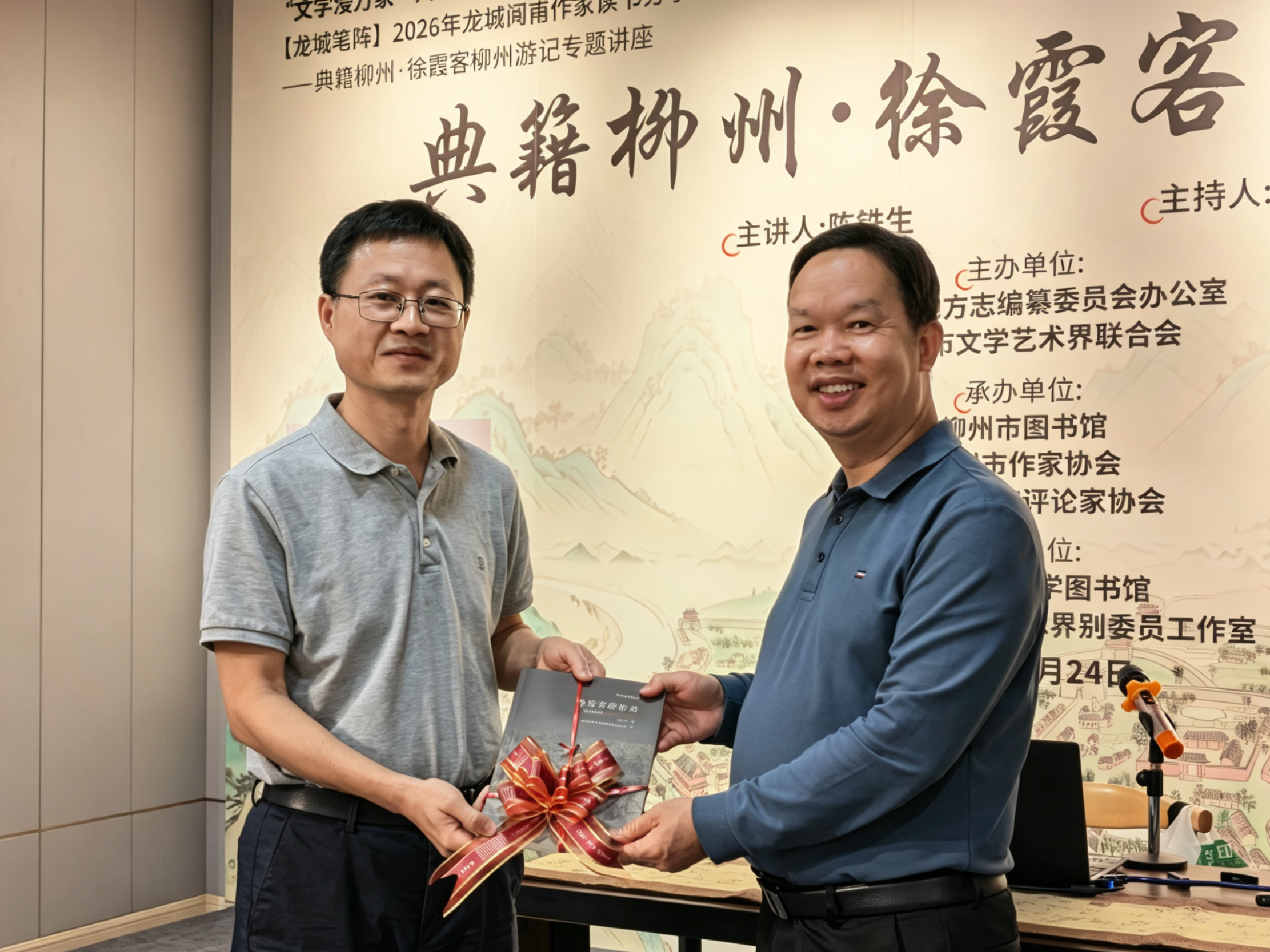 赵索军主任(左)代表市地方志办公室向市作家协会负责人赠送《徐霞客游柳州》